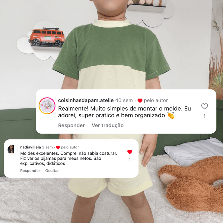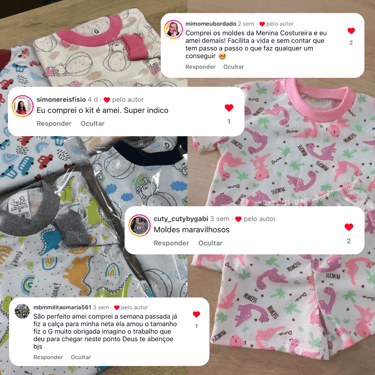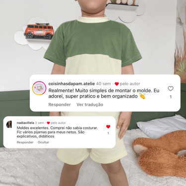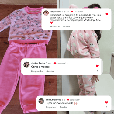 Todos os moldes incluem guia sequencial de costura, ajudando você a confeccionar cada peça com praticidade e segurança.